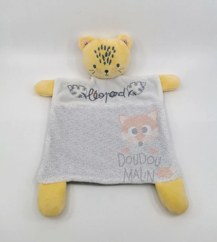 Doudou léopard Mots d’enfants bleu blanc 30 cm personnalisable.